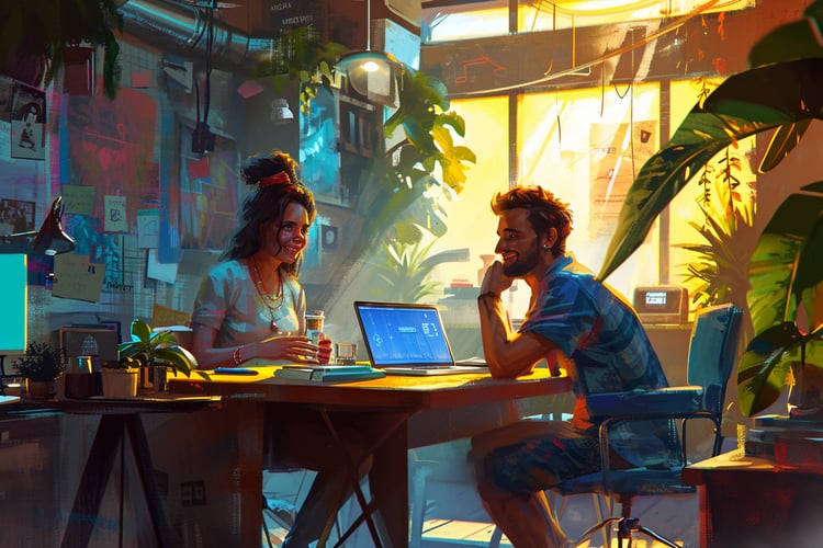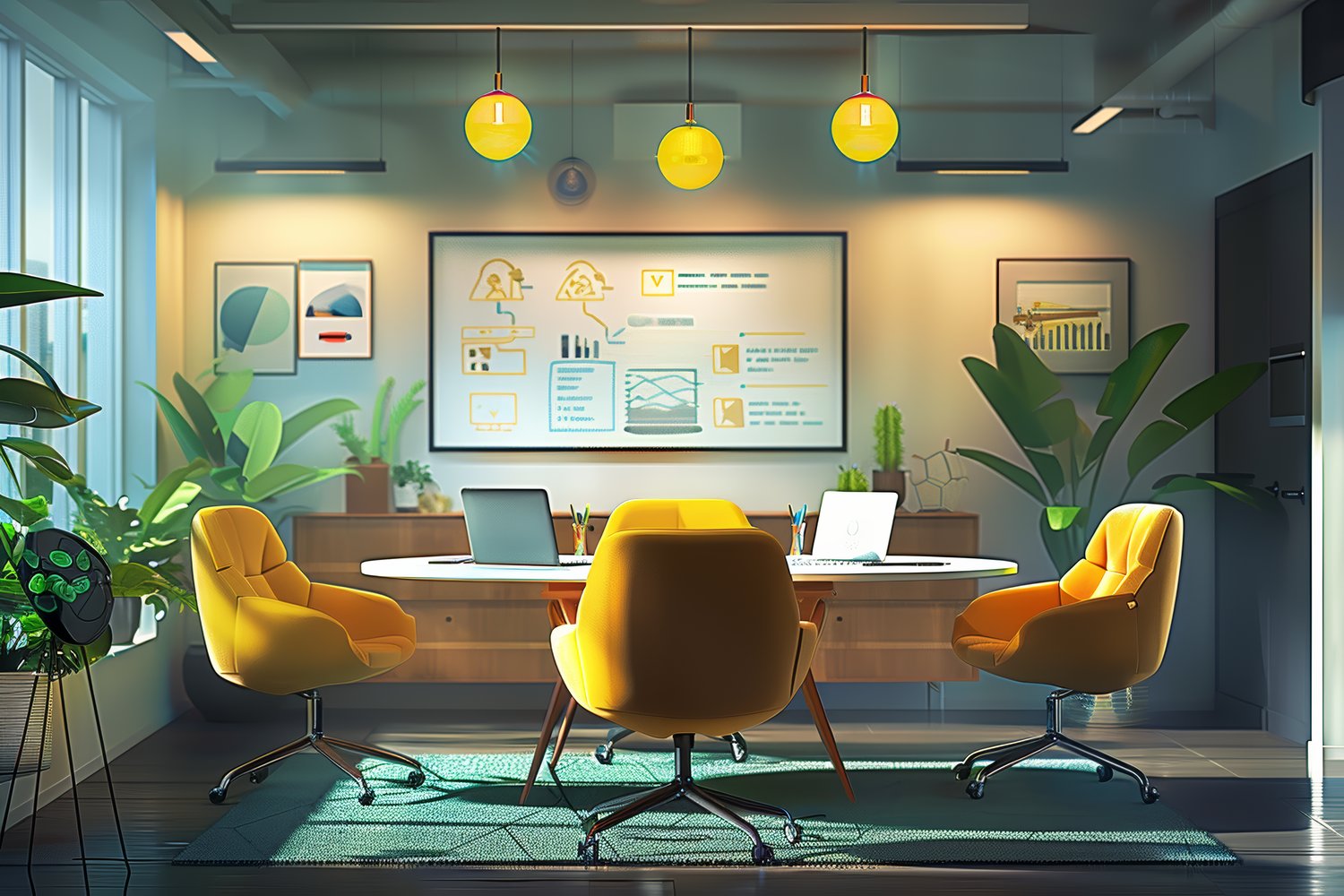 “Bright Conference Room Inspiration” illustrates a modern, vibrant meeting space designed to spark creativity and collaboration. This AI-generated image showcases a well-lit conference room with contemporary yellow chairs surrounding a sleek white table, complemented by laptops and office supplies, ready for a productive meeting. The background features a large screen displaying informative charts and graphics, indicating a space where ideas come to life.