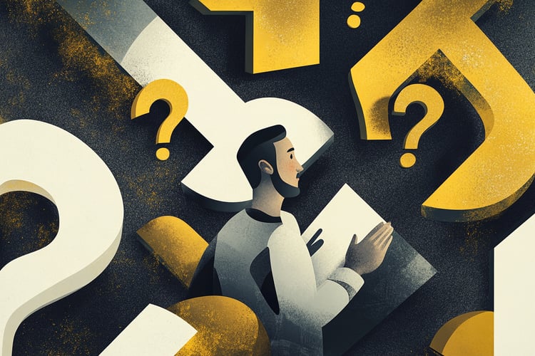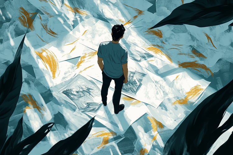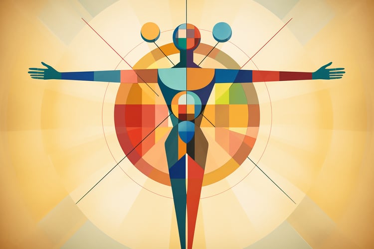 This illustration presents a group of people engaged in a calm, focused discussion within a dynamic, abstract environment of swirling blues and golds. The figures are seated in a loose circle, evoking a sense of open dialogue, inclusivity, and collective problem-solving. The surrounding abstract elements suggest energy, connectivity, and shared ideas moving freely between participants.