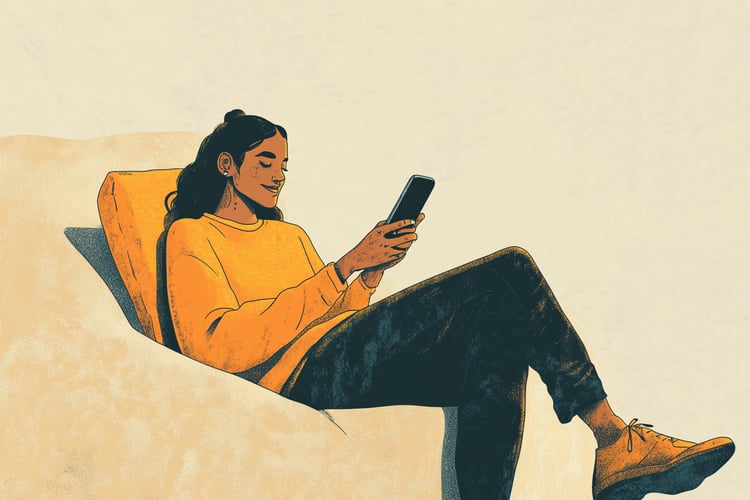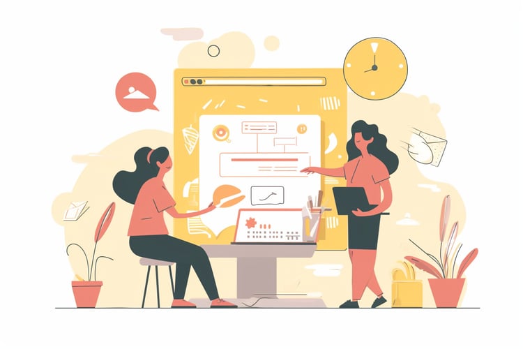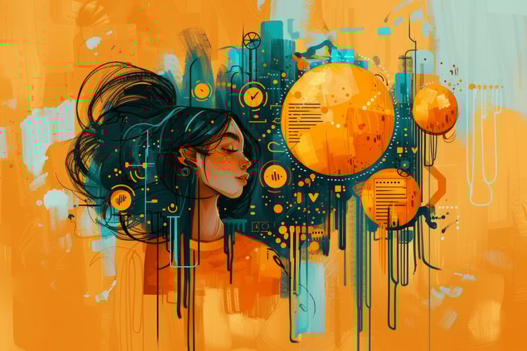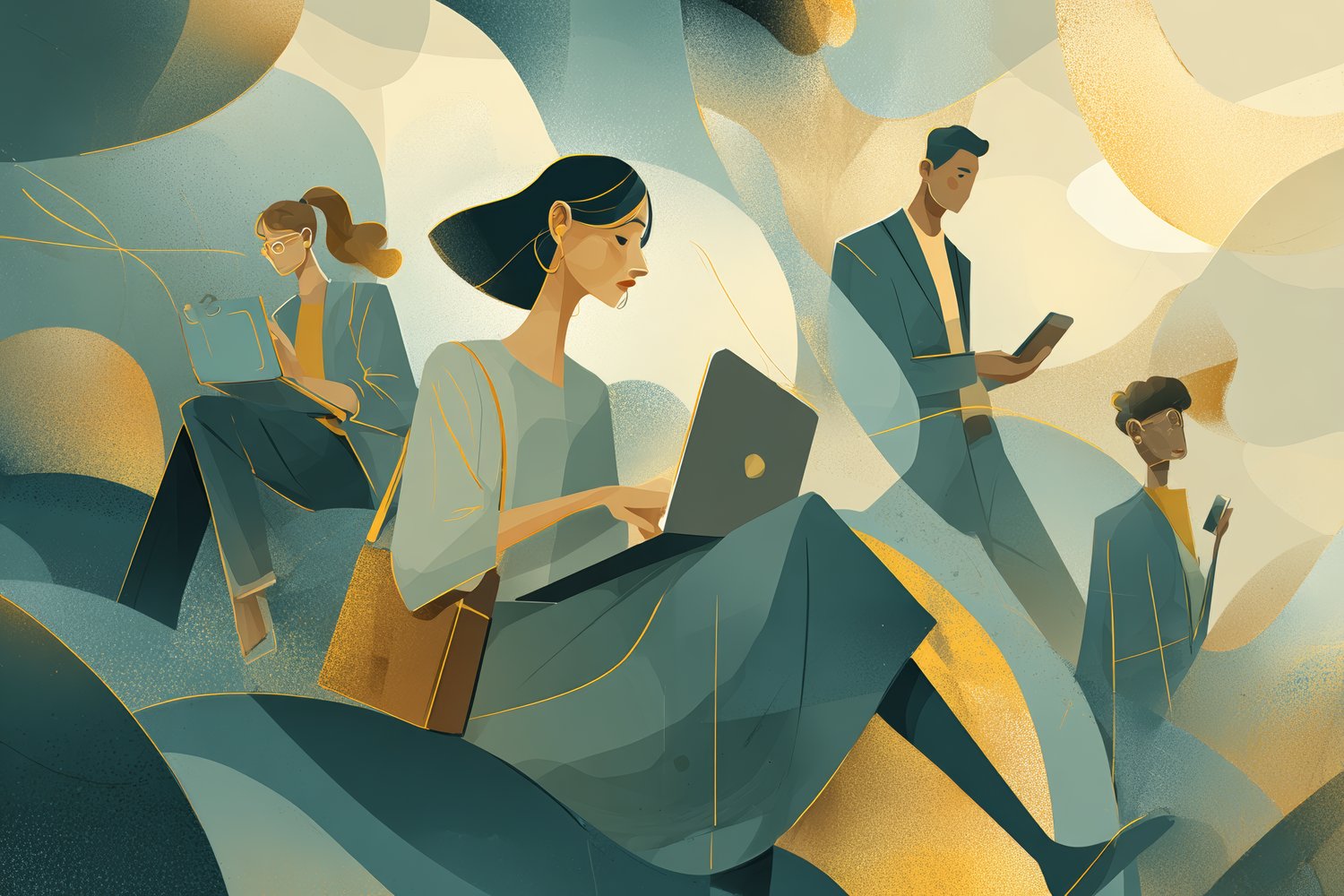 This elegant illustration captures a group of professionals working seamlessly in a modern environment. Each individual is engaged with their devices—laptops, tablets, and smartphones—symbolizing the interconnected nature of today's digital work culture. The soft blend of golden and teal hues, paired with the abstract flowing background, conveys a sense of focus, creativity, and collaboration.
