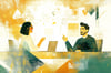 This dynamic illustration depicts a lively conversation between two colleagues in a professional yet approachable setting. With textured golden hues and soft green accents, the design radiates warmth, positivity, and creativity. The expressive characters and their open interaction convey themes of teamwork, idea-sharing, and constructive dialogue, set against an abstract background with subtle office motifs.