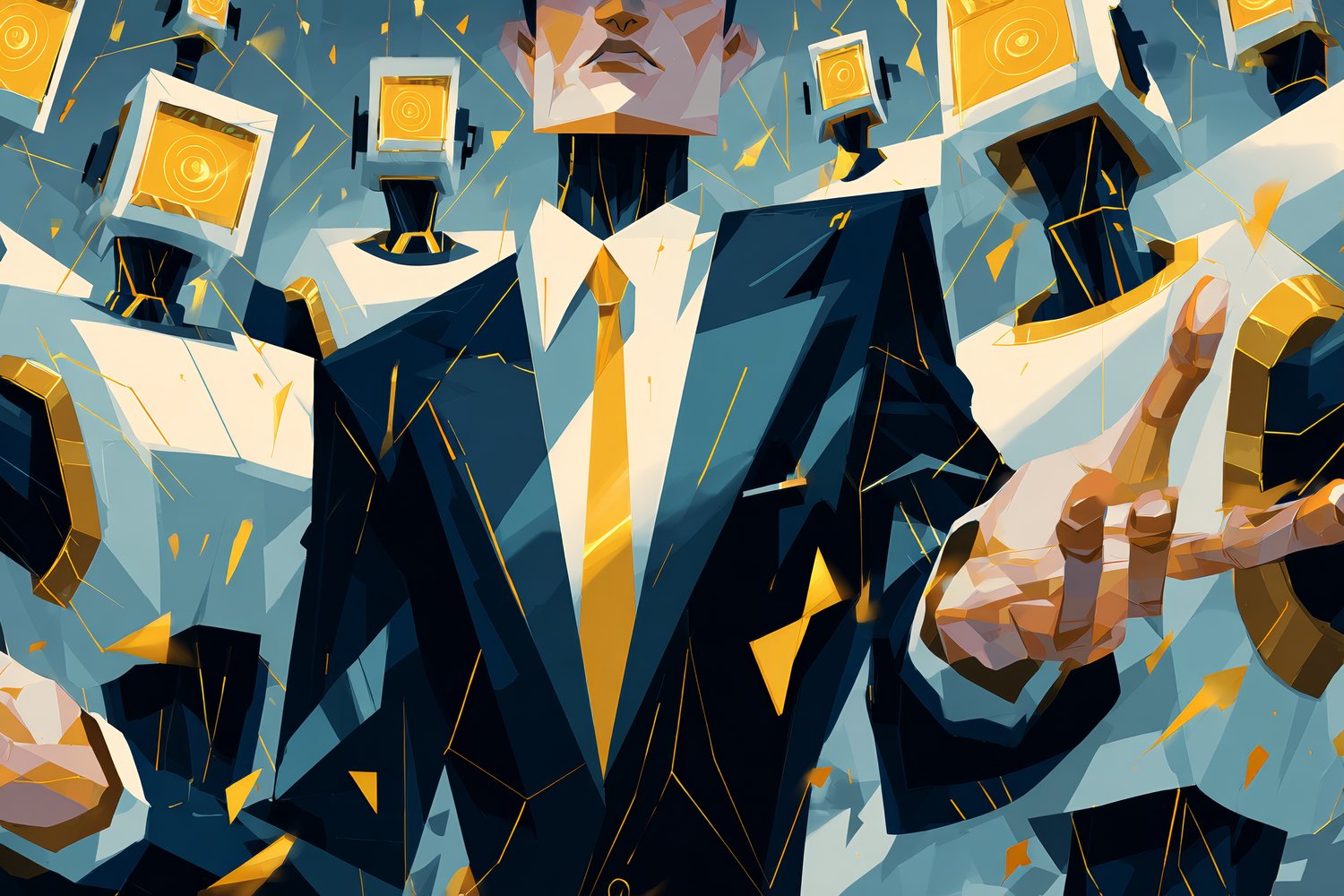 A sharply dressed figure in a suit stands confidently at the center, flanked by a group of humanoid robots with square heads glowing like screens. Their uniformity contrasts sharply with the commanding presence of the human—or perhaps post-human—leader, whose gesture suggests authority and control. The color palette of gold, white, and dark blue adds a sense of sleek, futuristic power, hinting at both corporate influence and technological domination.