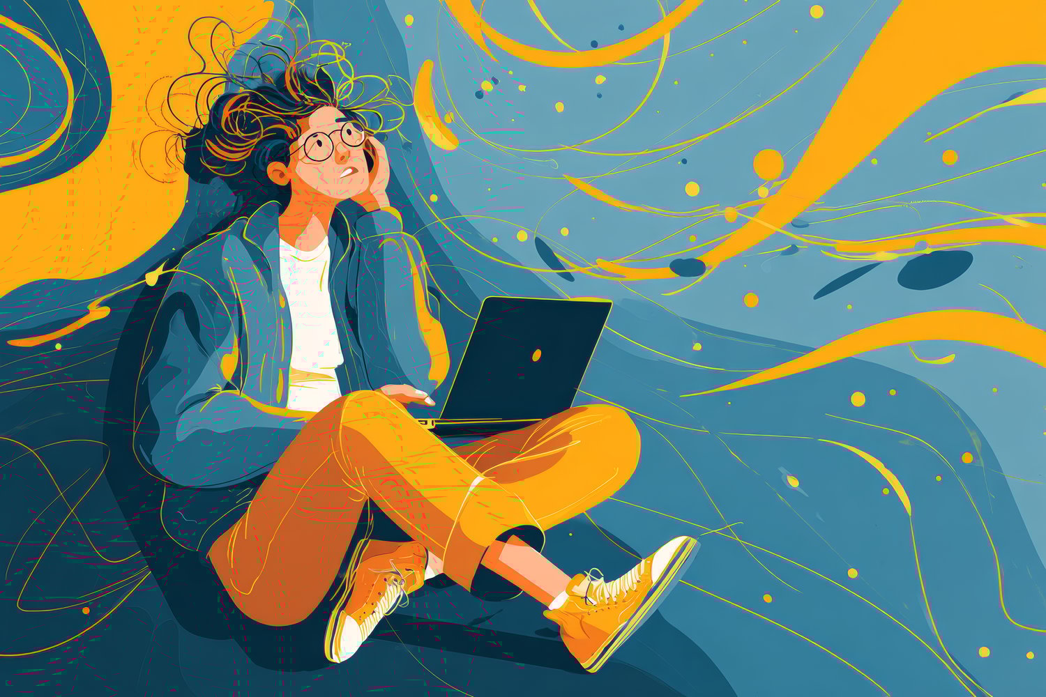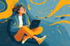 This vibrant illustration captures a whimsical moment of creative pause. A person sits cross-legged with a laptop in hand, their gaze drifting upward, lost in thought. Surrounded by flowing swirls of yellow and blue, the scene blends productivity with imagination, embodying the balance between focus and creative exploration. The expressive linework and warm, saturated colors give it a lively and relatable energy.