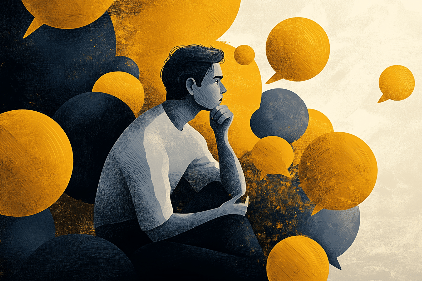 This compelling illustration captures a pensive figure deep in thought, surrounded by floating yellow and dark speech bubbles. The visual metaphor speaks to introspection, thoughtful dialogue, and the contemplation of ideas. With its moody tones and dynamic contrast between vibrant yellows and deep blues, the artwork communicates the quiet moments of reflection amidst the noise of conversations or ideas waiting to be expressed.