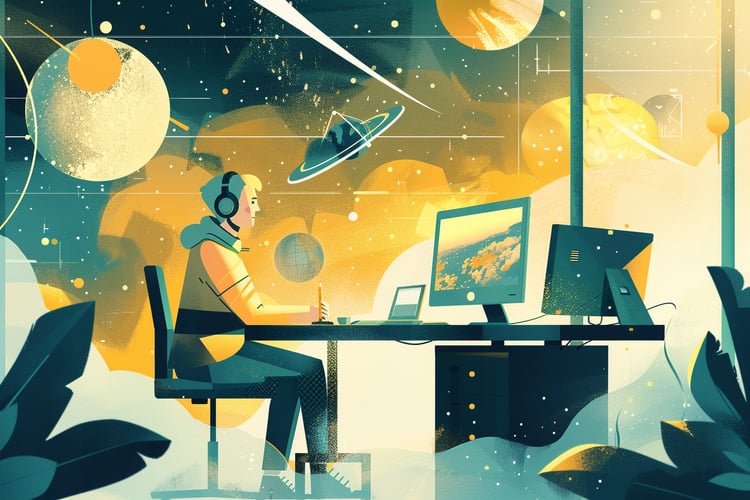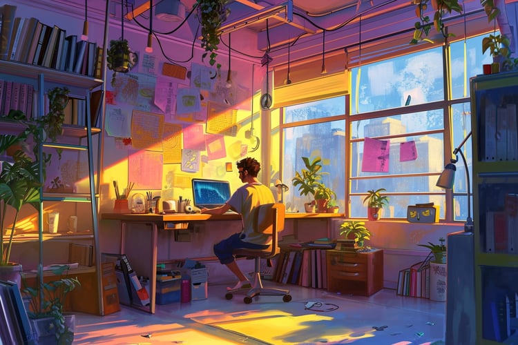 "Digital Strategy Session" captures the essence of modern collaboration and strategy planning in the digital realm. This AI-generated stock image features two professionals in a dynamic brainstorming session, surrounded by the digital interfaces and creative elements that symbolize the flow of ideas in the workplace. The warm, pastel color scheme creates an inviting and comfortable atmosphere, echoing the innovative and thoughtful processes that drive today's businesses forward.