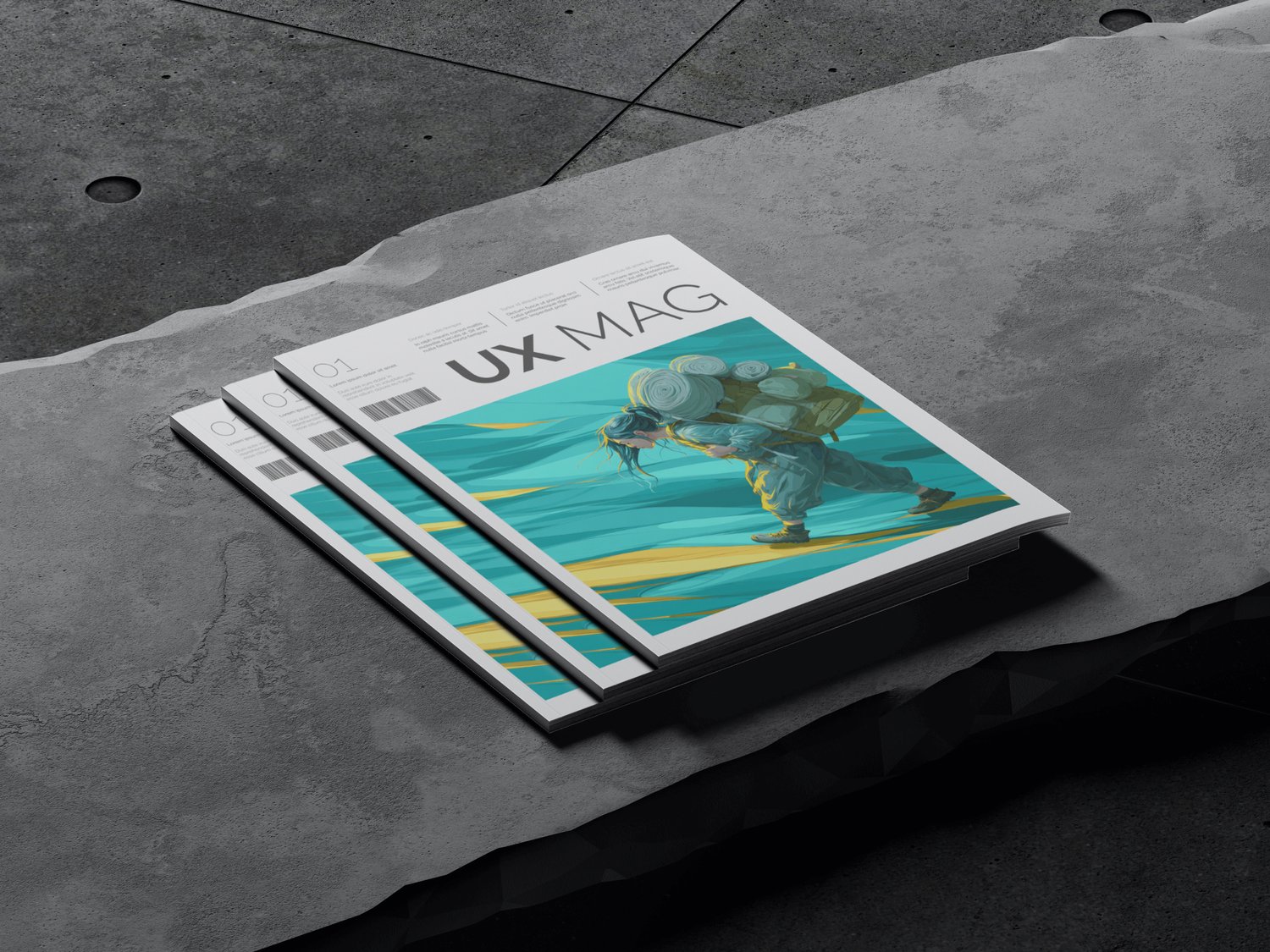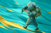 A lone traveler moves steadily forward, carrying a full backpack as flowing teal and turquoise forms sweep across the background like wind or water. Subtle streaks of warm yellow cut through the cool palette, emphasizing motion and direction. The figure’s posture suggests effort and determination, while the abstract environment keeps the scene timeless and symbolic rather than tied to a specific place.