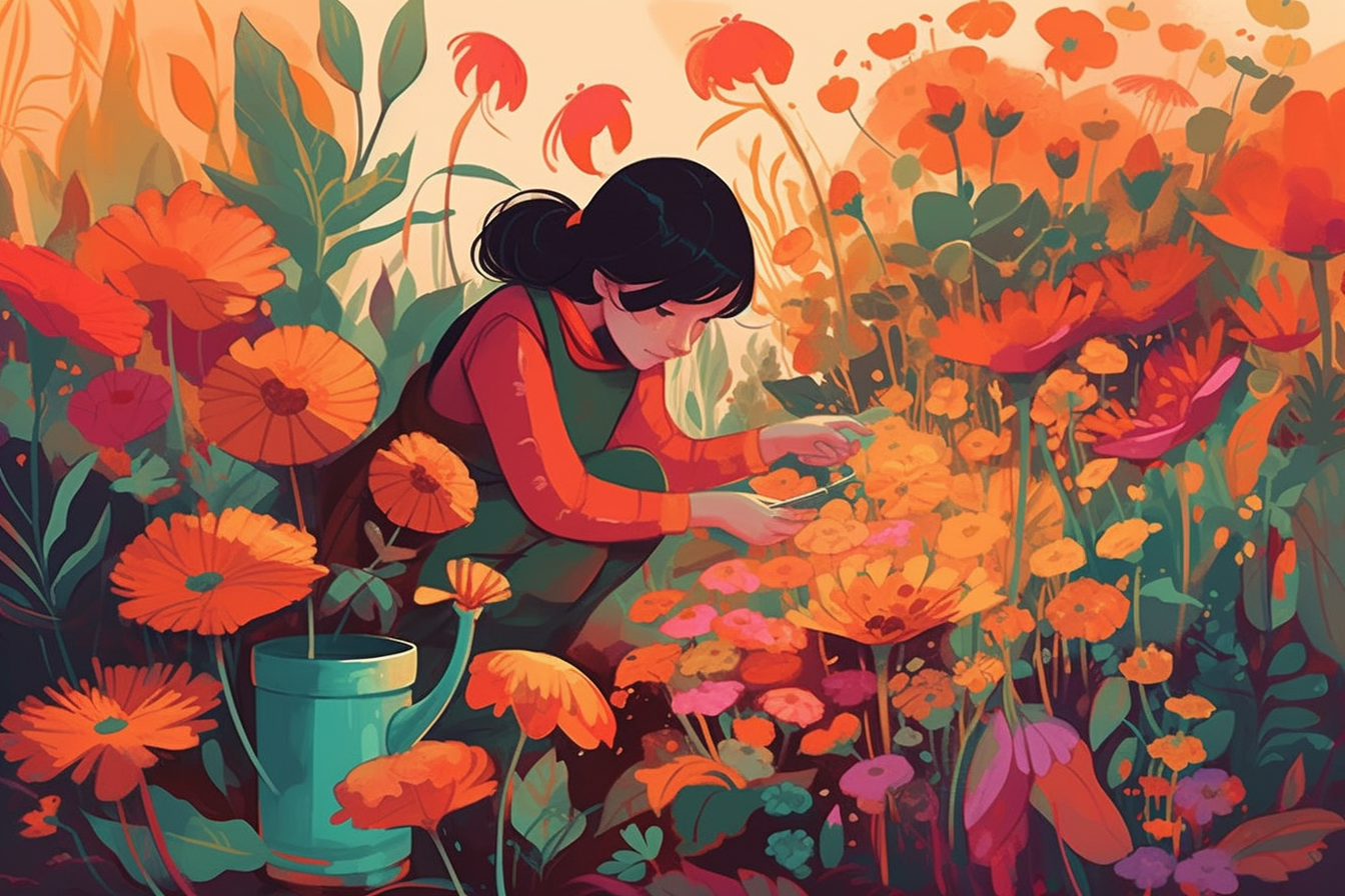"Garden of Dreams" is a vibrant journey into the world of color and emotion. This illustration captures the heartwarming scene of a young girl engrossed in the act of planting flowers. Every hue has been chosen with care, from the rich colors of the blossoms to the soft tints of the earth, crafting a vivid tapestry that instantly draws the eye. While the artwork might seem to emphasize emotion over strict realism, this choice is what grants the piece its undeniable charm.