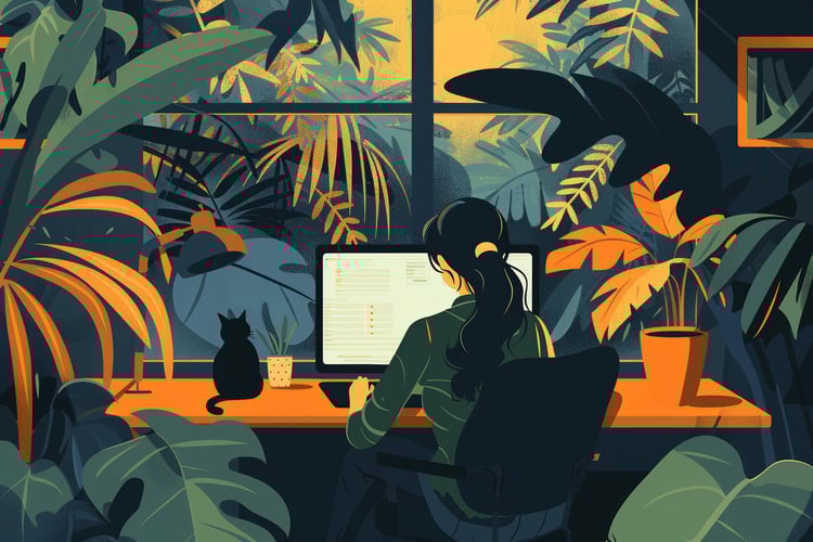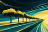 "Golden Roadway" captures the essence of a tranquil journey through a surreal landscape where nature and light intertwine. This illustration features a row of trees with vibrant golden foliage lining a road that seems to stretch endlessly into a horizon bathed in a warm, glowing light. The dynamic flow of the scene, with its sweeping lines and vivid color contrasts of deep teal and bright yellow, evokes a sense of calm and forward momentum, perfect for projects that symbolize progress, growth, and the beauty of the journey ahead.
