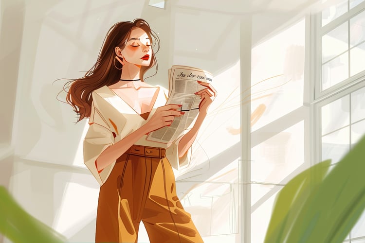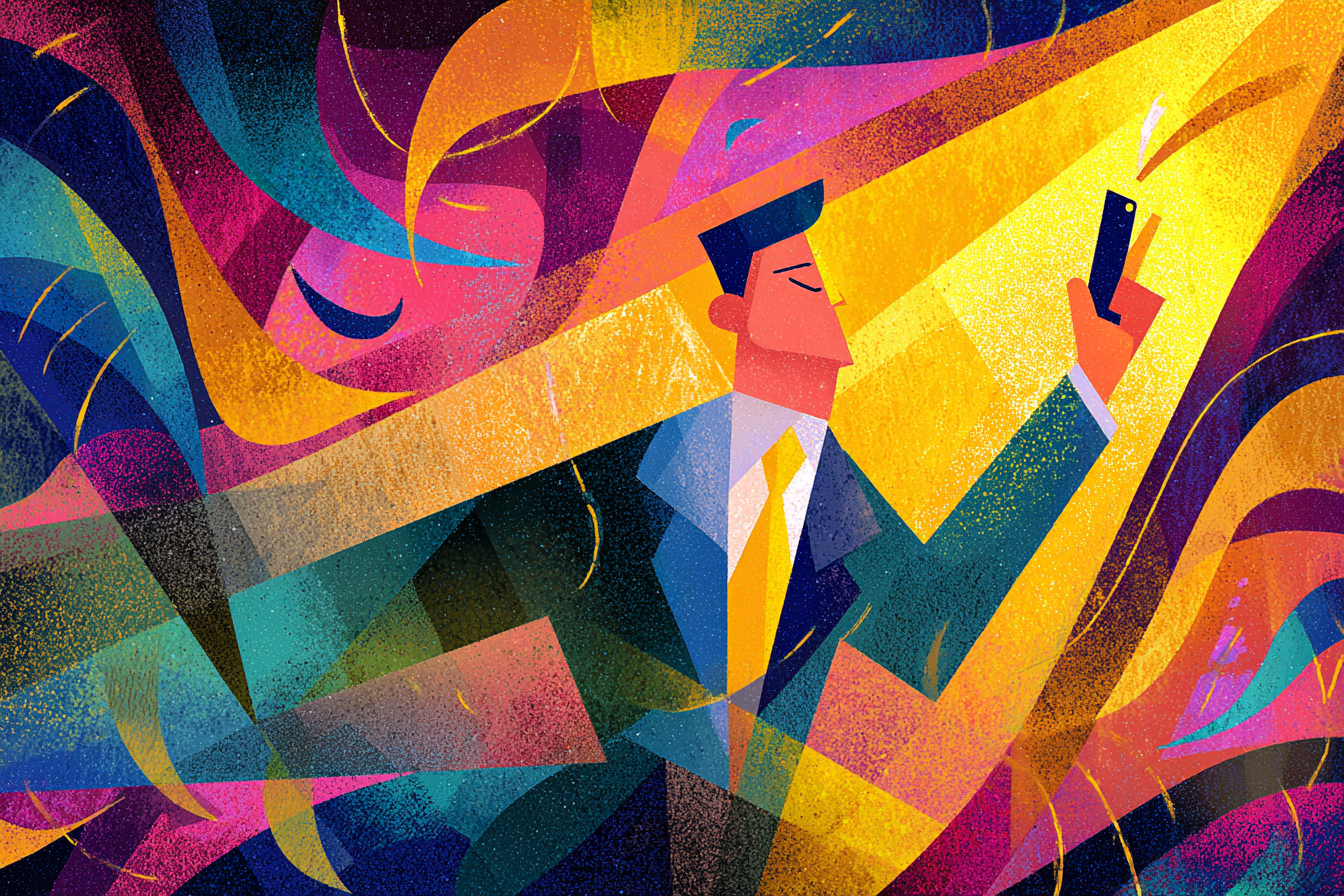 This vibrant illustration shows a person in a suit confidently holding up a smartphone as bold beams of yellow light cut through swirling waves of color. The scene feels energetic and intentional, capturing the way a single point of focus can bring clarity amid noise. The geometric style and rich palette of blues, pinks, and golds give the image a modern, expressive feel that draws the viewer in.