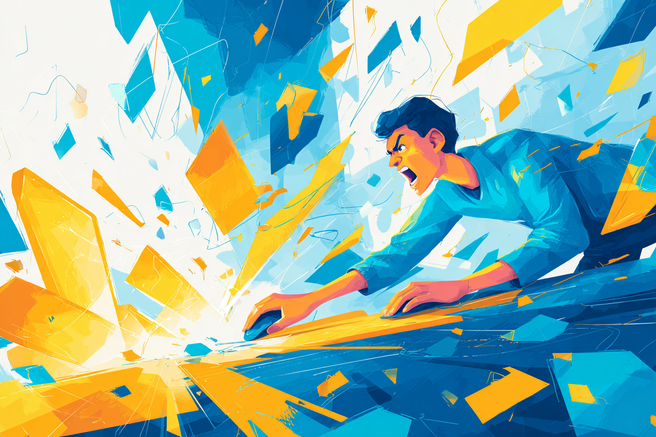 This dynamic illustration captures a moment of high-energy concentration as a person leans into their task, gripping a computer mouse with explosive intensity. Bursts of blue and yellow shards fly outward from the screen, creating a sense of urgency, motion, and digital immersion. The exaggerated expression and movement convey emotions ranging from frustration to fierce determination, resonating with themes of gaming, tech challenges, or creative breakthrough.