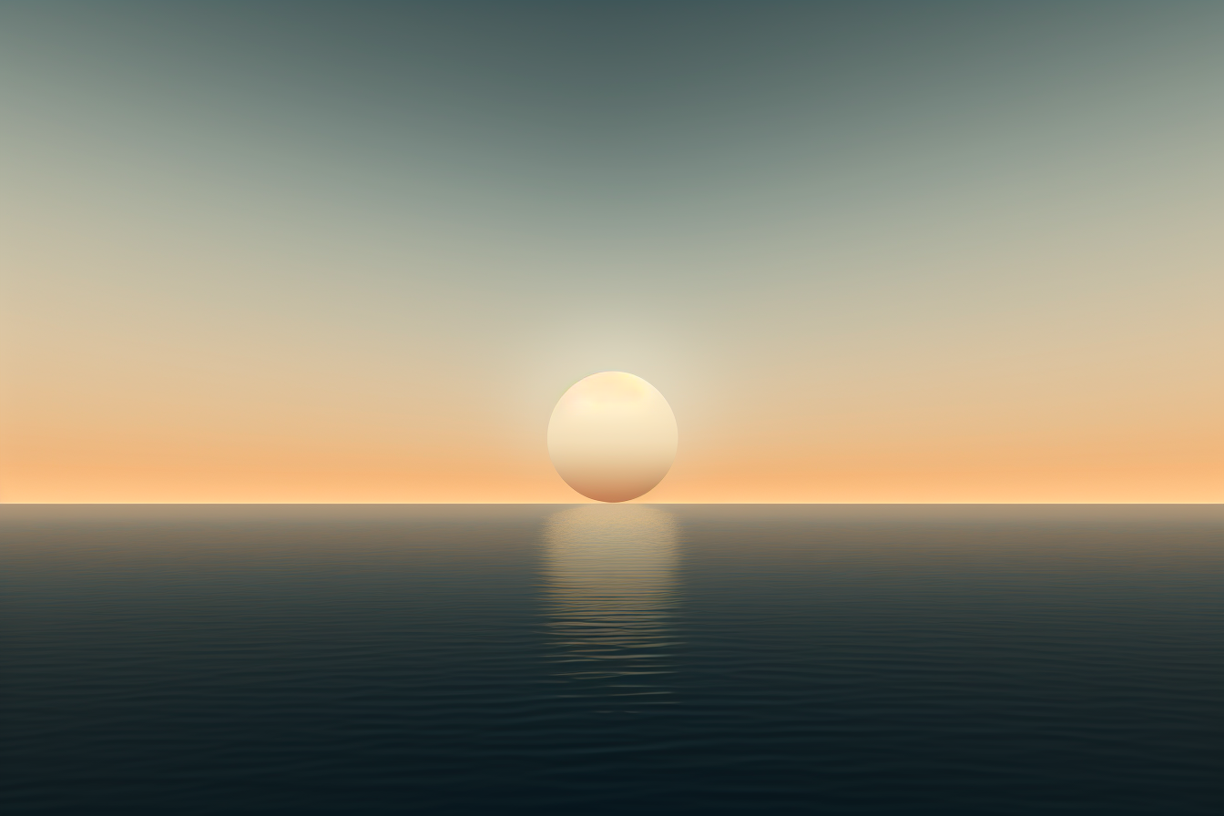 Discover "Luminous Tranquility", a serene visual journey that captures the delicate dance of nature's most elemental forces. At the heart of this tranquil scene is a vast, calm body of water, its undisturbed surface reflecting the world above with a crystal-clear mirror effect. Just above the horizon, the warm glow of dawn or dusk bathes the scene in gentle amber hues, creating a dreamlike ambiance. Yet, what truly sets this image apart is the pale egg-white sphere, hovering gracefully above the horizon, adding a touch of surreal mystique to an otherwise grounded landscape.