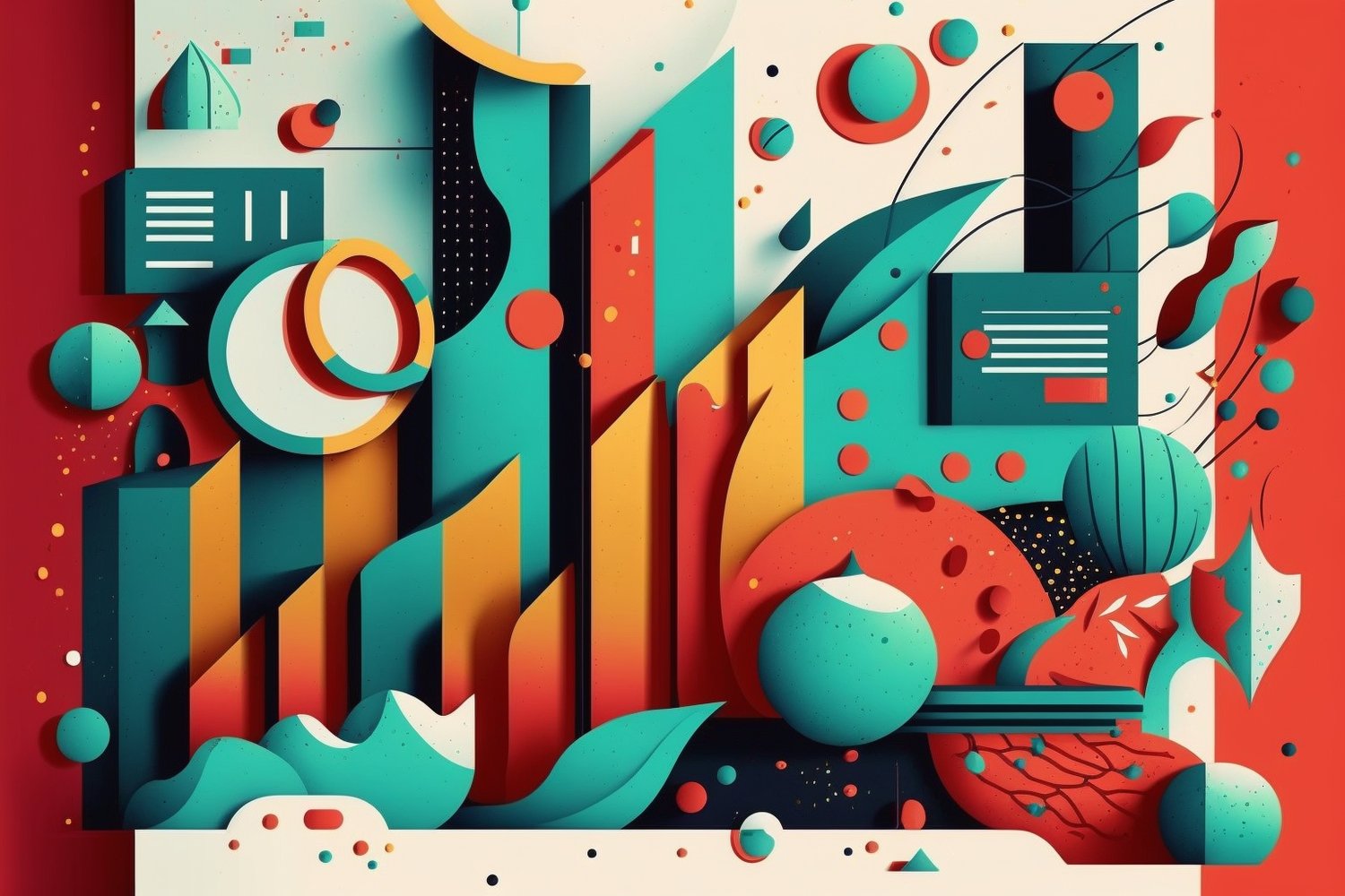 "Nature's Geometry" invites you to explore a breathtaking 3D illustration where the wisdom of nature meets the elegance of abstraction. With teal and red tones subtly transitioning through gradients, this piece evokes the serenity of natural landscapes while embracing bold patterns and typography. The innovative page design takes inspiration from the work of colorful muralists, offering a striking yet harmonious visual experience that resonates with both modern aesthetics and timeless themes.