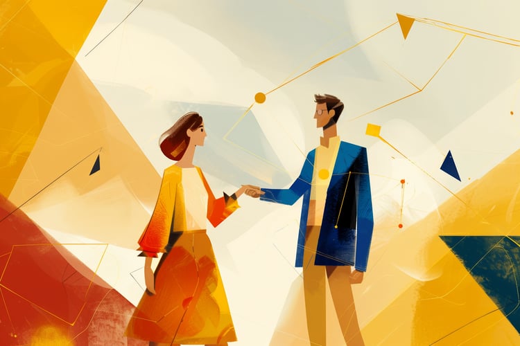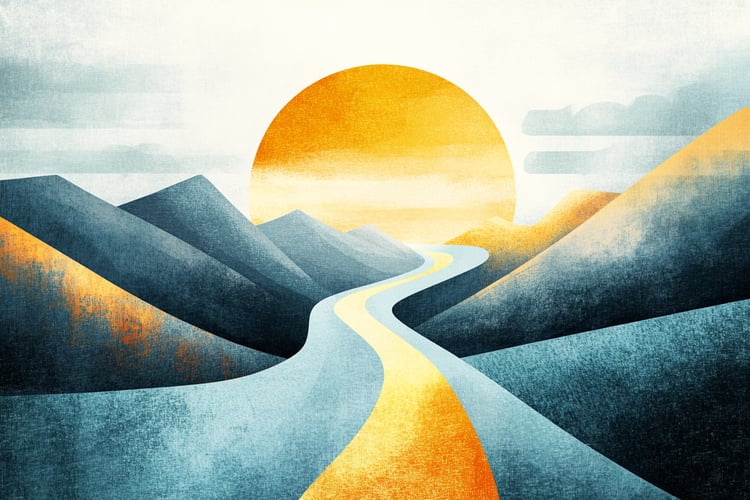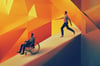 This conceptual illustration captures two individuals journeying together along a sharply inclined, abstract path: one walking and the other in a wheelchair. The contrasting warm shades of orange and yellow light up the path, creating an atmosphere of resilience and unity as they face the ascent side by side. This powerful scene conveys themes of accessibility, support, and inclusivity, suggesting that progress is made stronger when barriers are acknowledged and shared.
