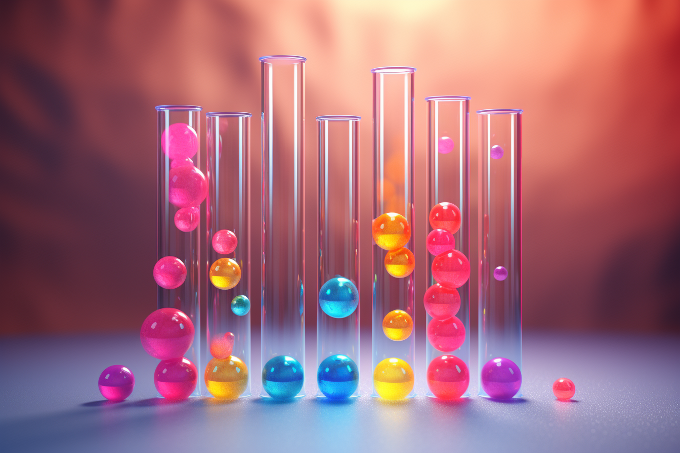 "Spectrum of Inquiry" invites you to explore the beauty of science and art merging into one stunning visual experience. Each test tube in this image is a vessel of vibrant orbs, symbolizing the bubbling curiosity and colorful discoveries that science inspires. The harmonious array of luminous spheres ascending through the glass columns against a warm, gradient backdrop offers a mesmerizing spectacle that appeals to educators, students, and anyone with an appreciation for the aesthetic elegance of research and experimentation.
