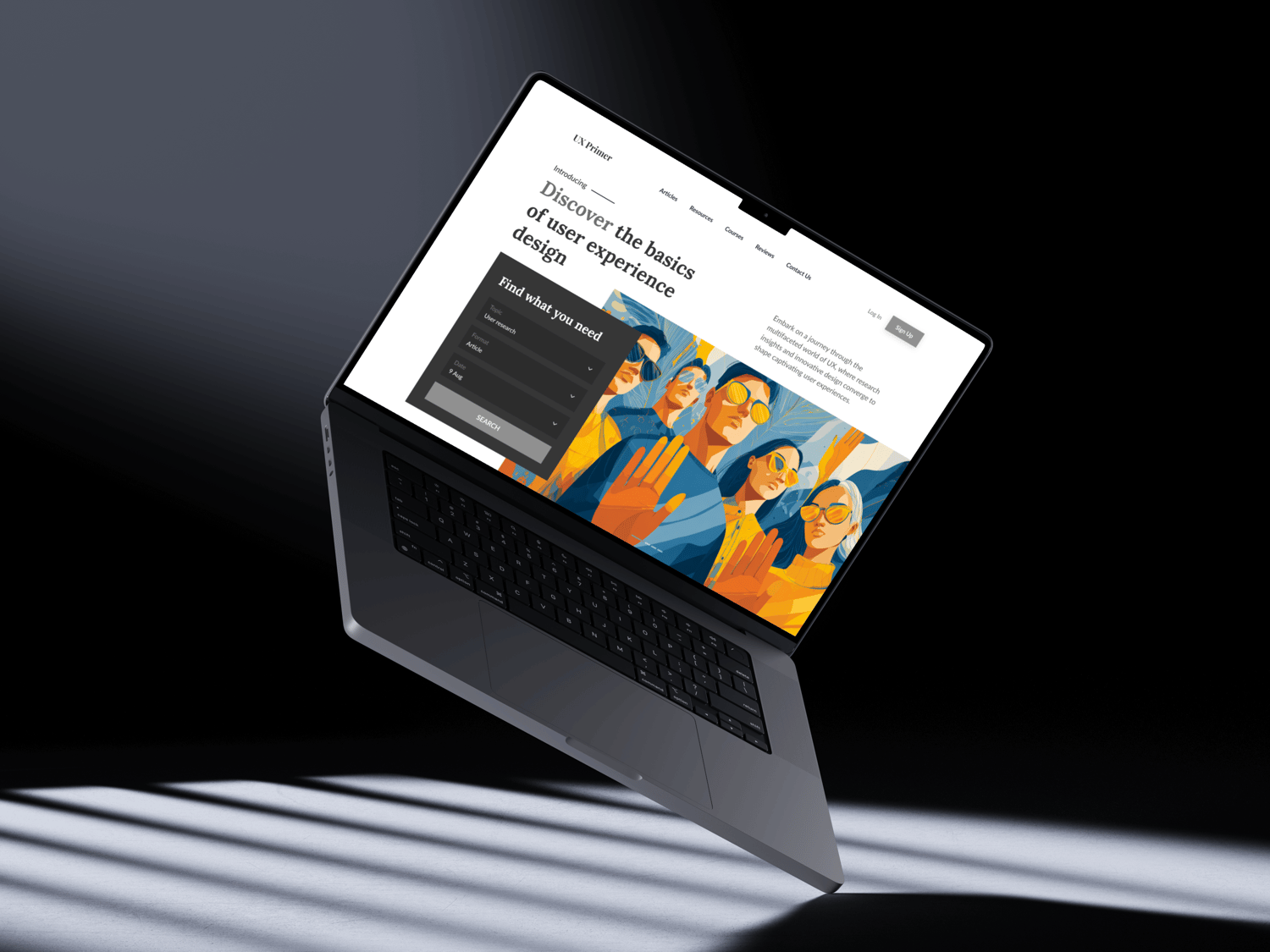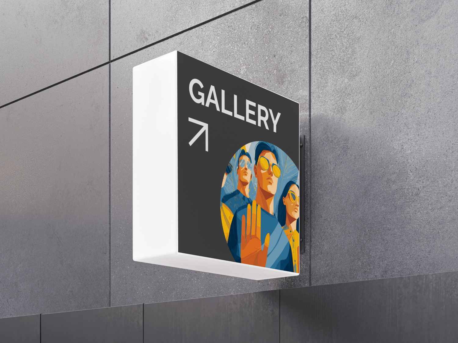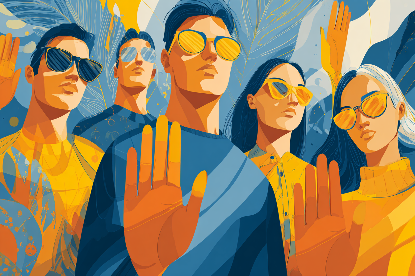 This bold and stylized illustration features a group of confident individuals standing together, hands raised in a firm, unified gesture of defiance or boundary-setting. Dressed in vivid blues and yellows, with reflective sunglasses and serious expressions, they exude self-assurance and collective strength. The dynamic composition and modern color palette add energy and visual impact to the overall message of solidarity, resistance, or self-empowerment.