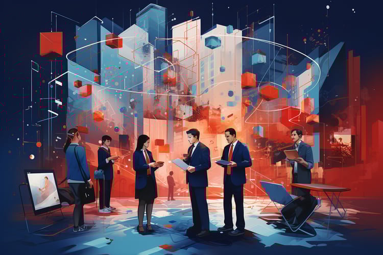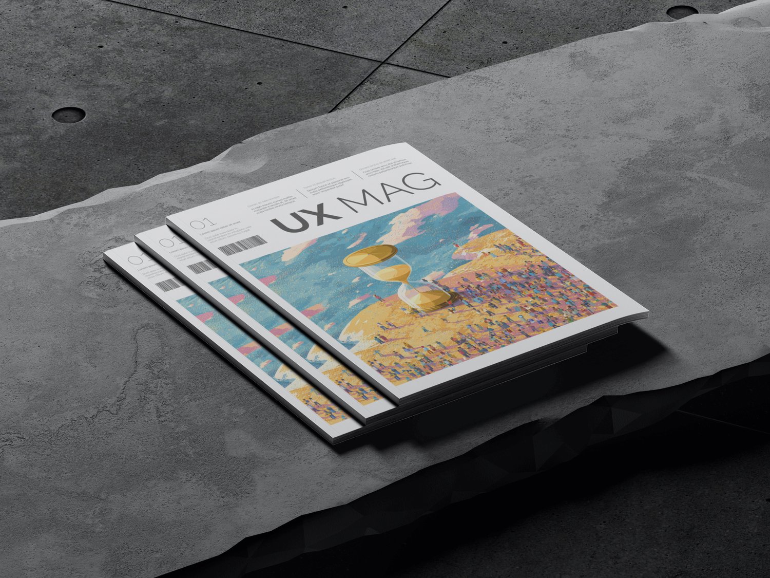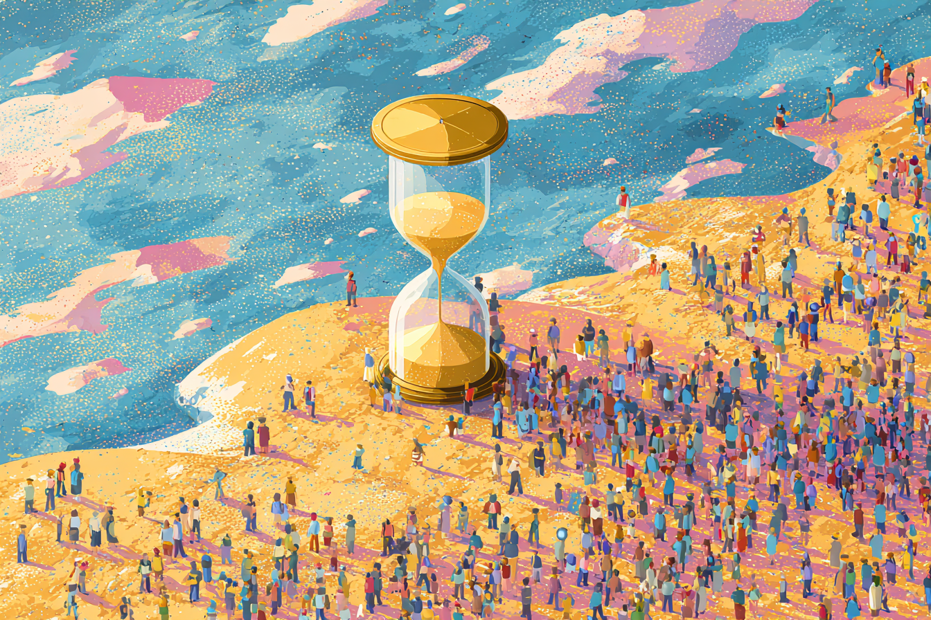 In this vivid illustration, a golden hourglass towers over a vast, sun-drenched landscape, its sand mid-fall — caught in a moment that seems both eternal and fleeting. A diverse crowd of people surrounds it, all looking toward the hourglass with a quiet urgency, their shadows stretched long in the warm light. The scene is at once calm and buzzing with anticipation, suggesting a collective reckoning with time.